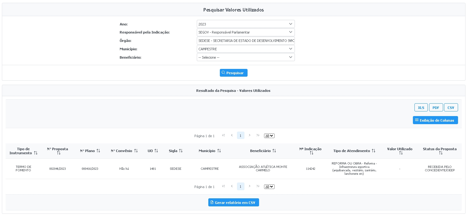 Além disso, nele há informações de valores utilizados da indicação e nº do instrumento vinculado (em caso de indicação tipo CONVÊNIO ou RESOLUÇÃO.