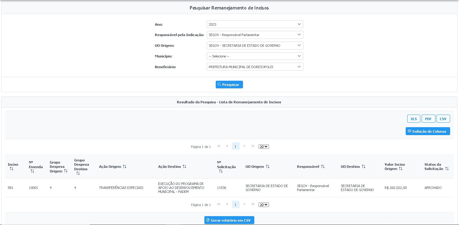 exibe todos os incisos do parlamentar, discriminando o seu valor inicial, o seu valor após os remanejamentos para outros incisos, e o montante indicado. Diversos filtros podem ser utilizados na geração do relatório, caso o usuário deseje visualizar somente os incisos de um determinado órgão, por exemplo.