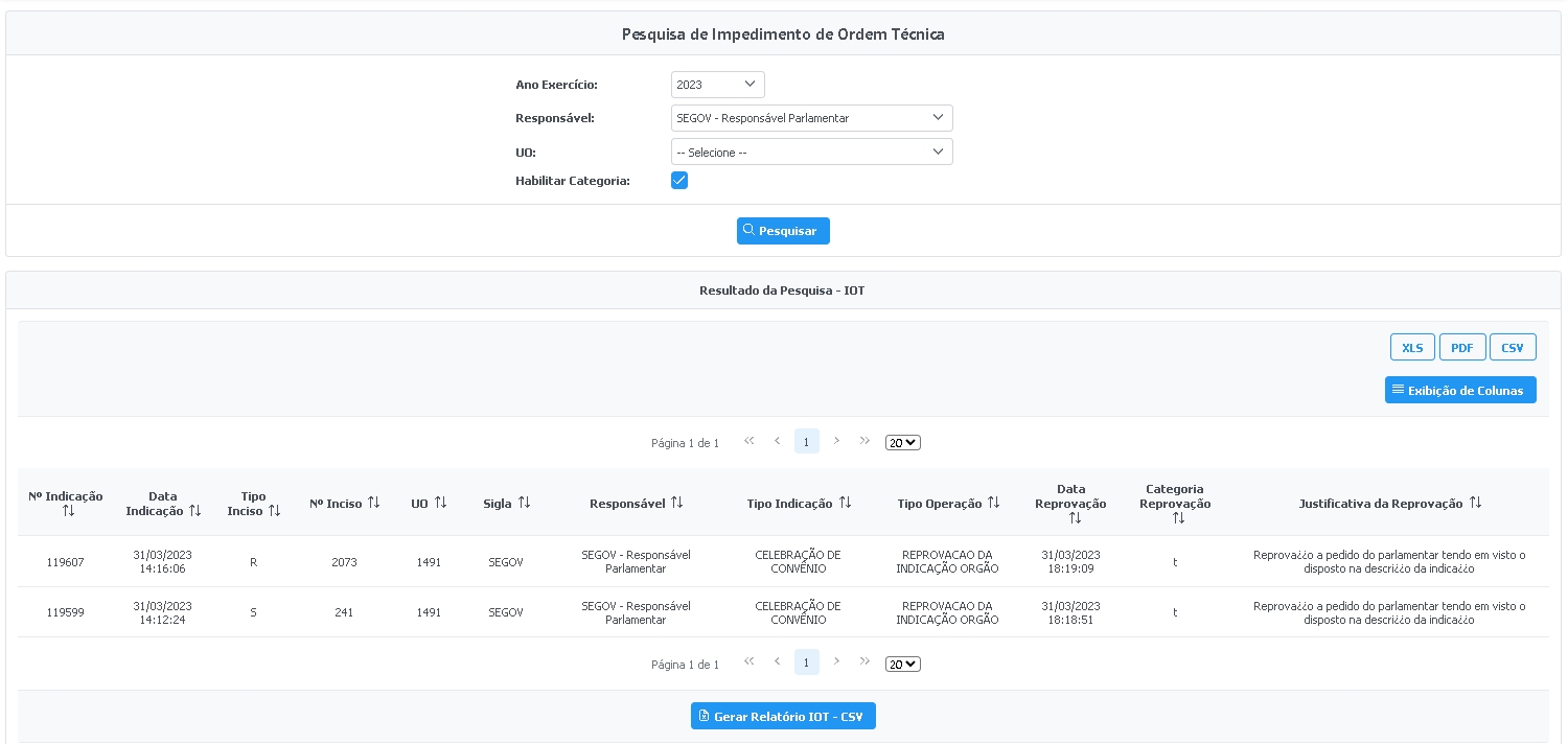 O relatório contém informações dos valores de Impedimento de Ordem Técnica (caso tenha), remanejamento constitucional e indicações sanadas.