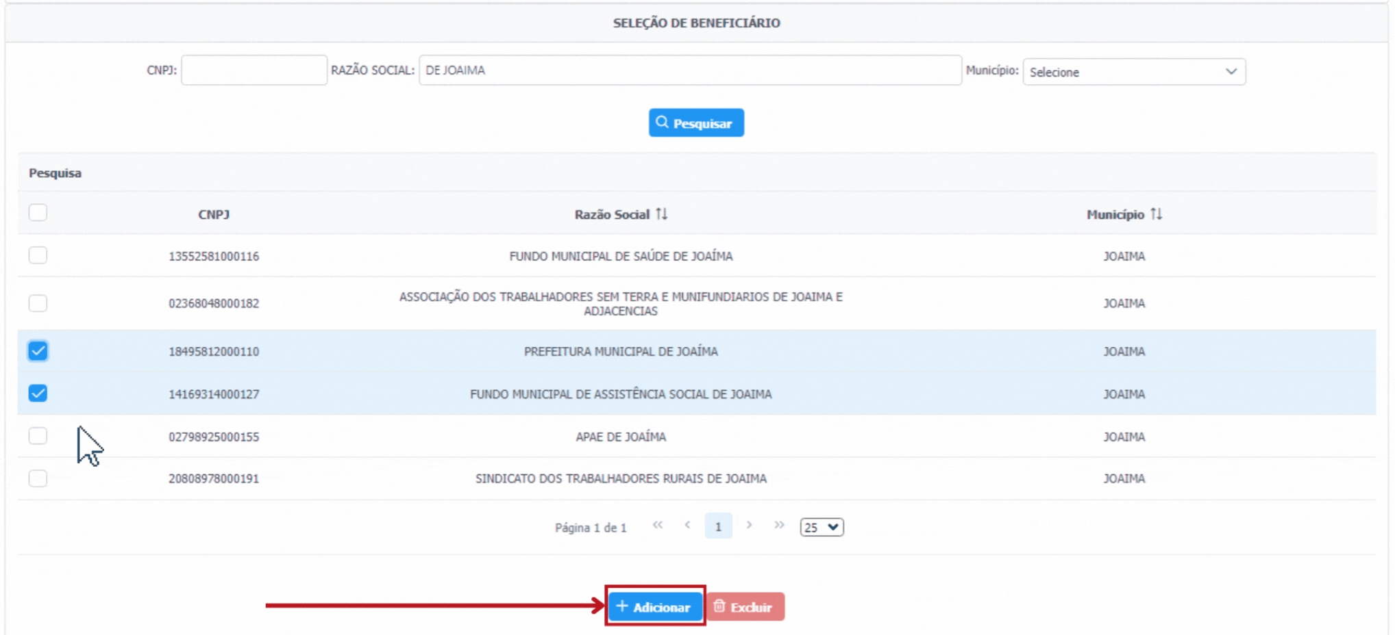 Na tabela de resultados, marque os beneficiários desejados.