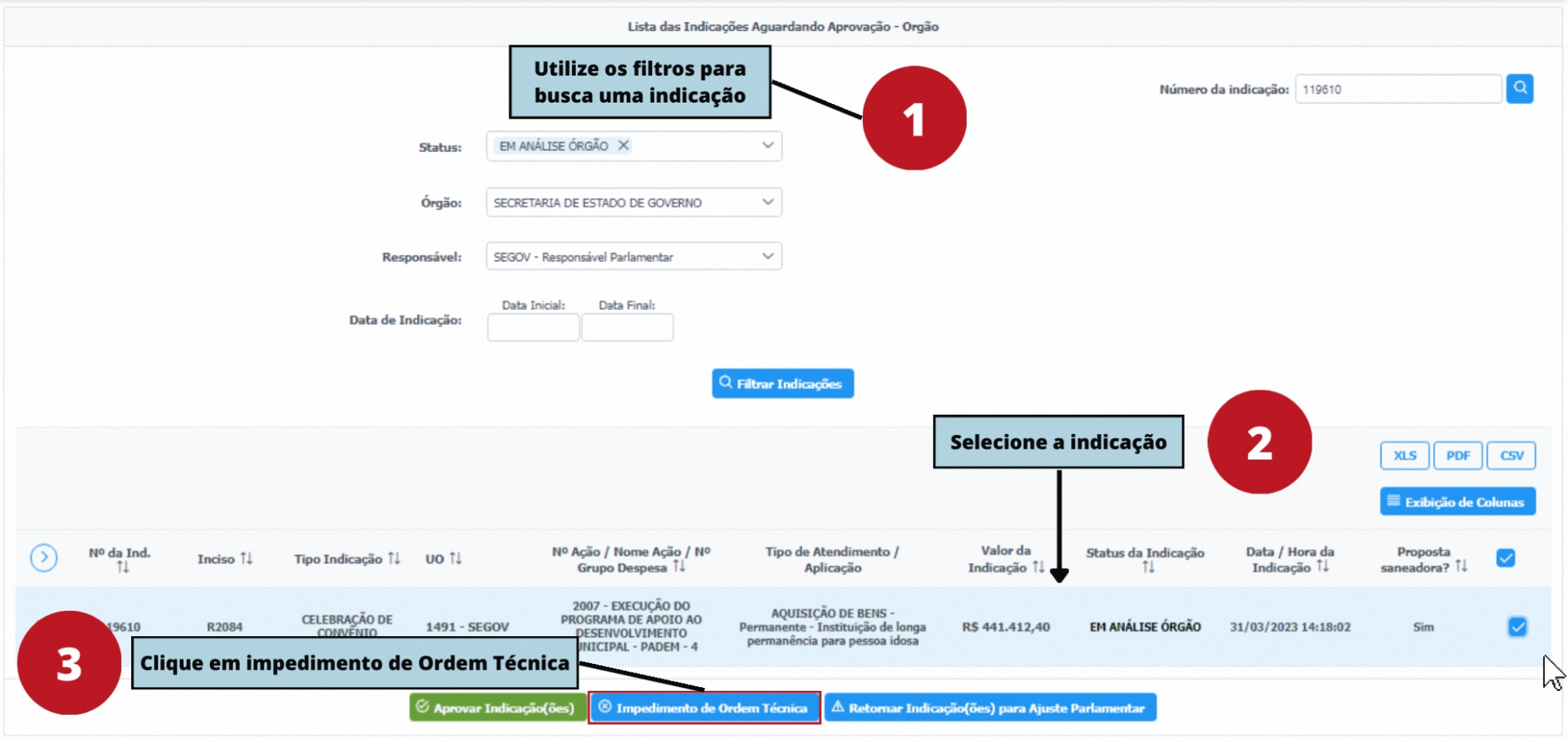 Selecione uma indicação e clique no botão de Impedimento de Ordem Técnica, conforme instruções na imagem abaixo.