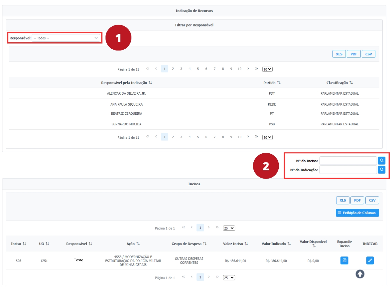 1. A busca pode ser feita pelo nome do responsável (1), pelo nº do inciso ou nº da indicação (2).