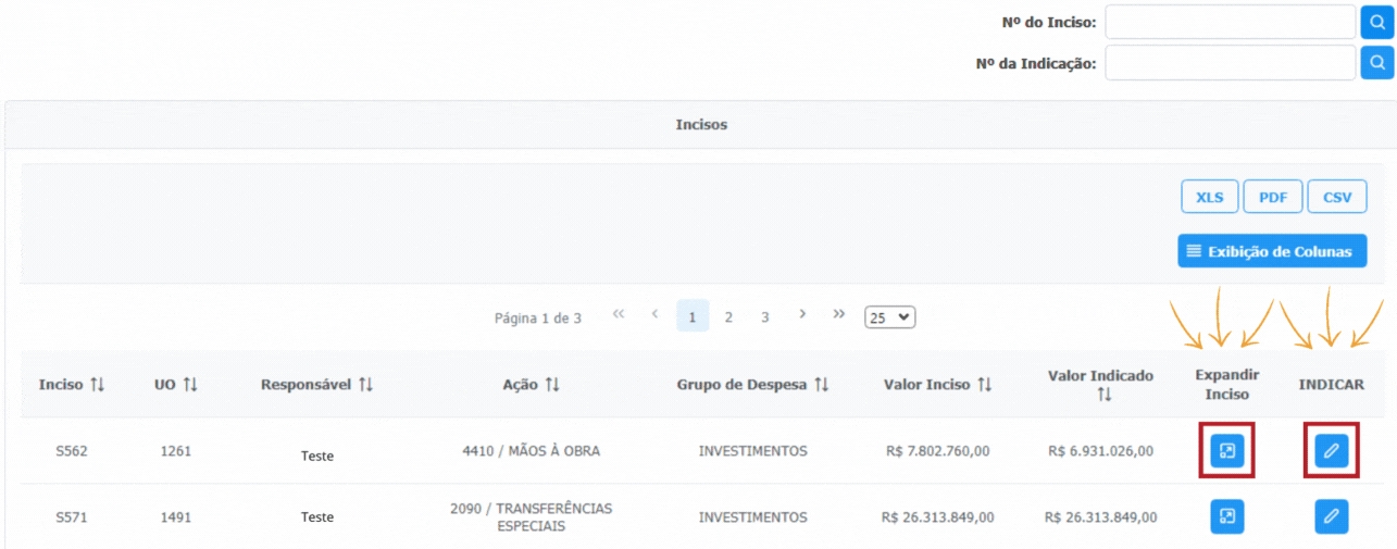 Na tabela "Indicação de Recursos" são exibidos os incisos do parlamentar, assim como as informações relativas à unidade orçamentária, à ação, ao grupo de despesa e aos valores disponíveis para indicação.