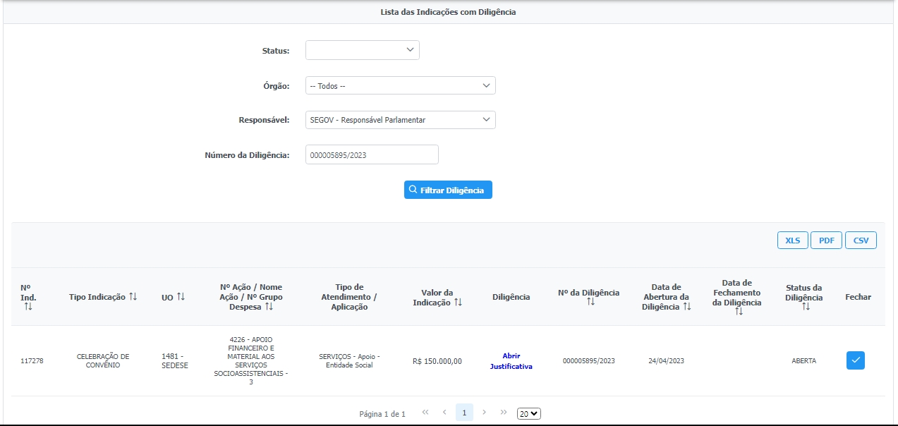 2. Na próxima tela será listada todas as diligencias informadas para o parlamentar para fins de visualização e o usuário pode utilizar dos filtros para pesquisar uma diligência especifica: