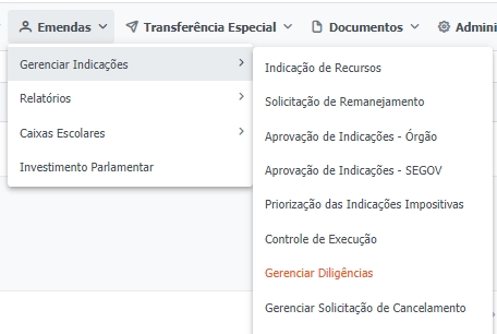 Emendas > Gerenciar Indicações > Gerenciar Diligências, conforme a imagem abaixo: