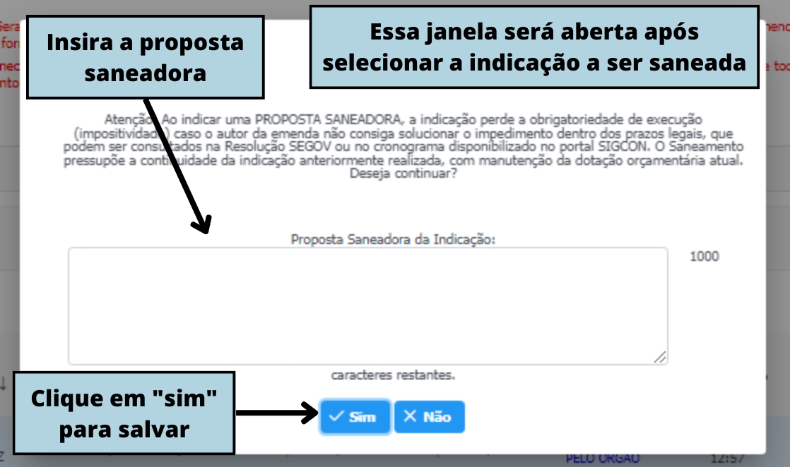 Para apresentar a proposta saneadora de uma indicação: o usuário deverá selecionar a indicação, o sistema exibirá uma mensagem de confirmação e o campo para preenchimento da proposta saneadora que o usuário deverá preencher.