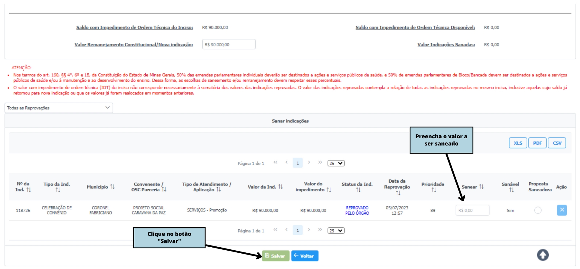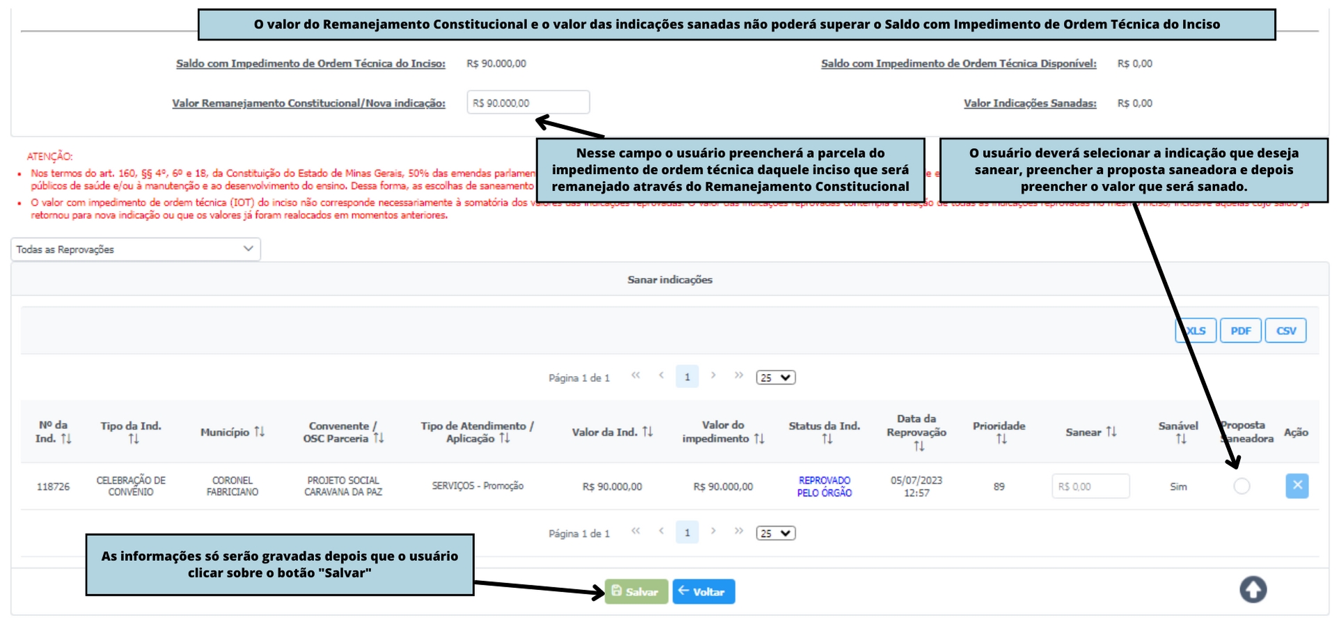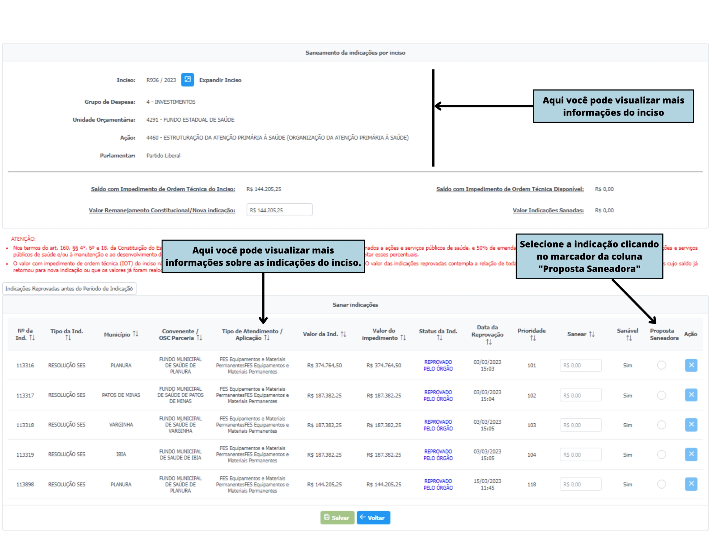 Na próxima tela estará disponível o saldo com impedimento de ordem técnica para realizar proposta saneadora ou realizar o remanejamento através do Remanejamento Constitucional.