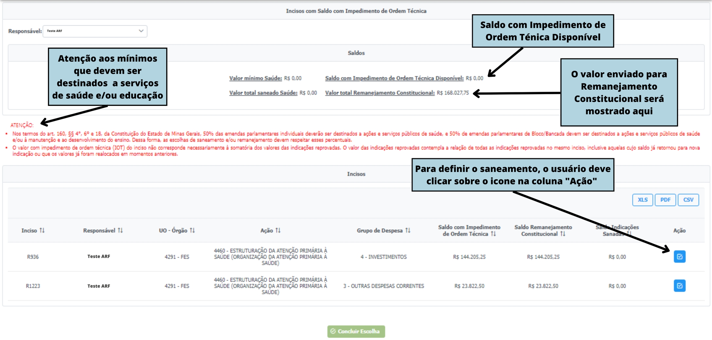 ATENÇÃO: O montante do “Saldo com Impedimento de Ordem Técnica Disponível” para o qual o parlamentar não apresentar proposta saneadora ou apontar que esse recurso será remanejado perderá a impositividade conforme os prazos estabelecidos na Resolução SEGOV e na Lei de Diretrizes Orçamentárias do ano vigente, que pode ser conferida no site http://www.sigconsaida.mg.gov.br/emendas/.