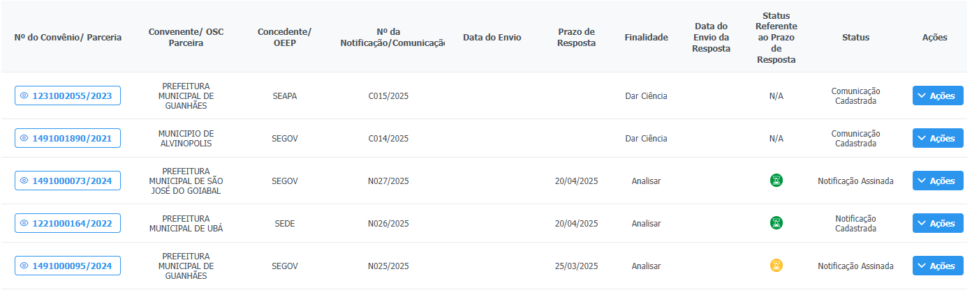 3. O resultado da pesquisa irá trazer todas as comunicações e notificações já registradas: