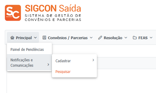 1. No menu "Principal" acessar, "Notificações e Comunicações", depois clicar em "Pesquisar":