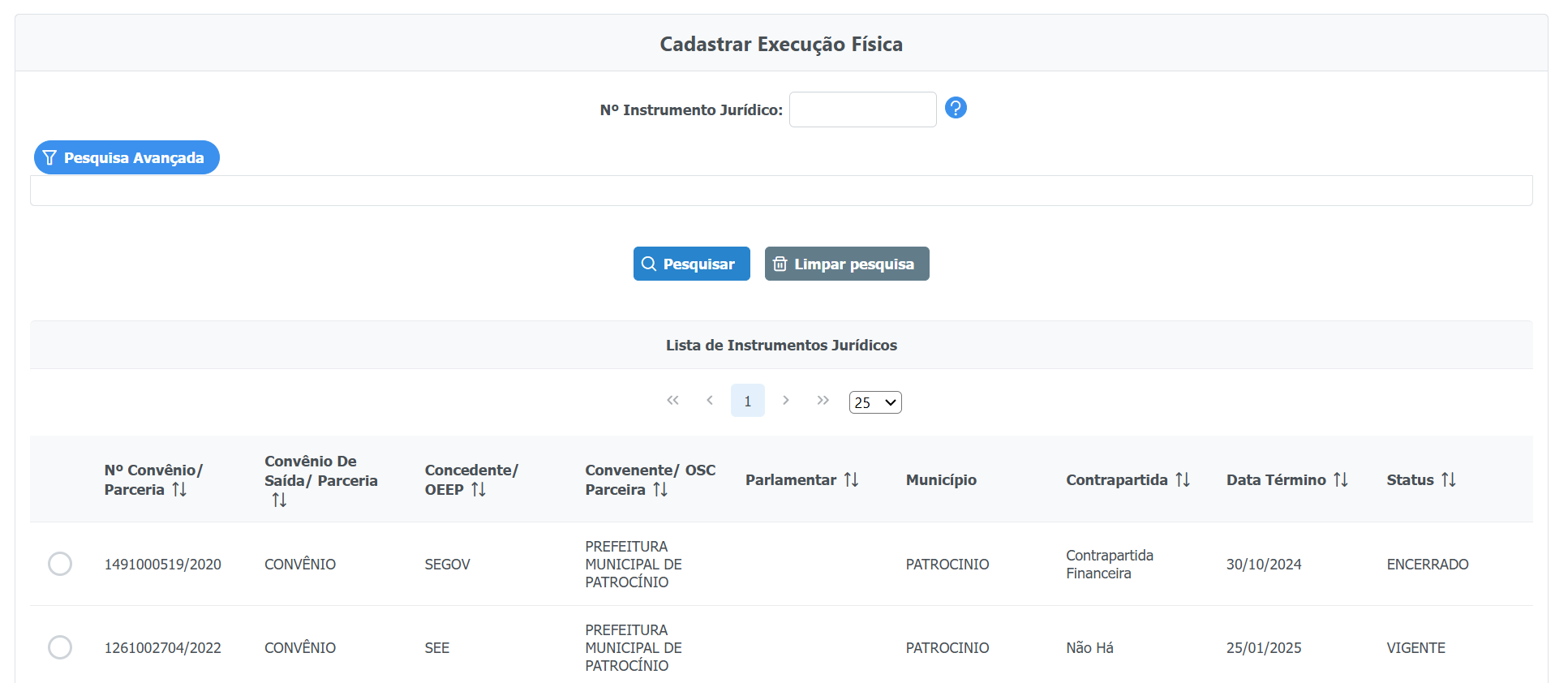 Digite o número do instrumento para cadastro ou utilize a ferramenta de "Pesquisa Avançada" para mais parâmetros de pesquisa. Em seguida, clique em "Pesquisar".