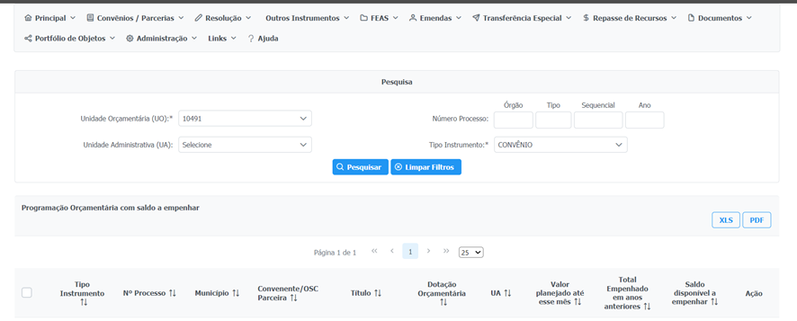 2) Digite um dos parâmetros de pesquisa disponíveis para a pesquisa do instrumento desejado com programação orçamentária realizada e com saldo a empenhar . Em seguida, clique em "Pesquisar":