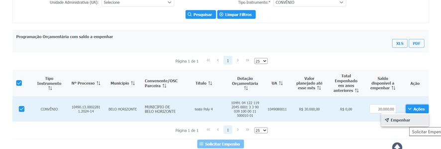 3) Ao final da página, selecione o instrumento desejado na lista de instrumentos com "Programação Orçamentária com Saldo a Empenhar" e clique em "Solicitar empenho":
