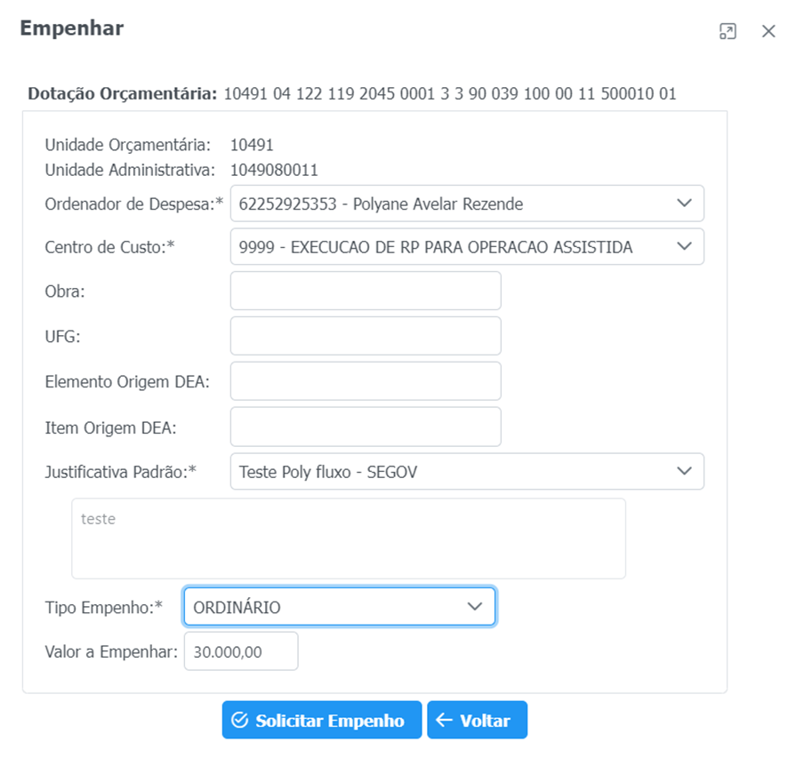 4) Preencha as informações necessárias na tela de empenho e clique em "Solicitar empenho":