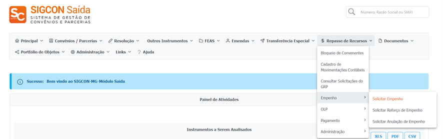 1) Acesse o Sigcon-saída GRP, clique no menu "Repasse de Recursos > Empenho > Solicitar Empenho":