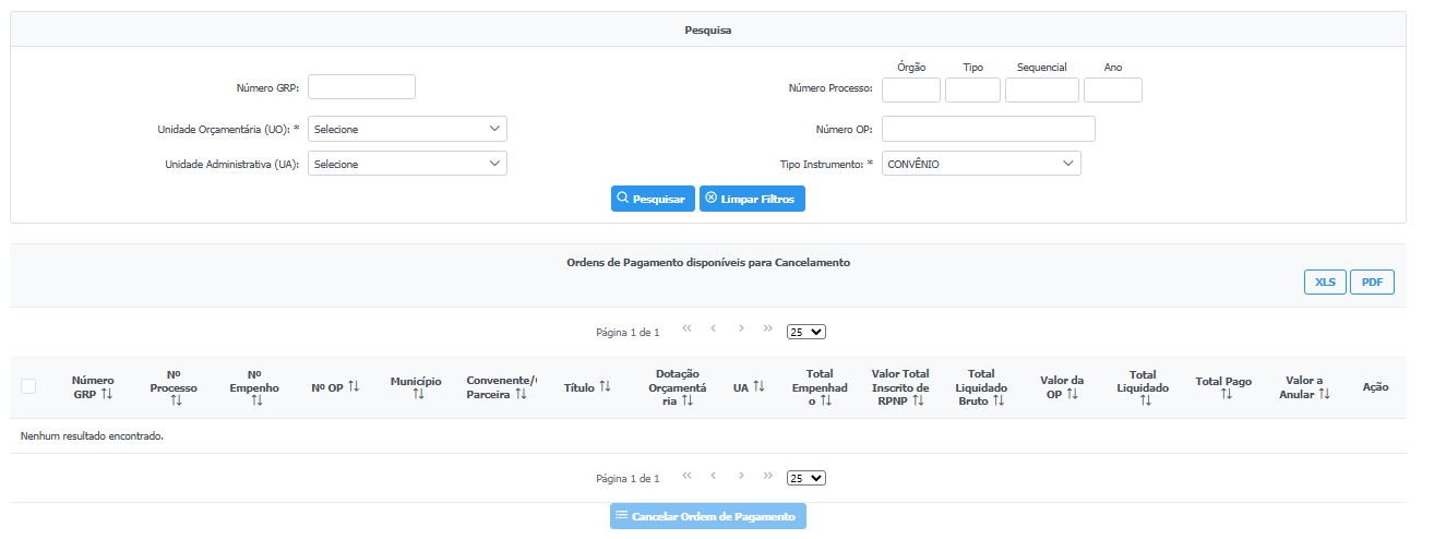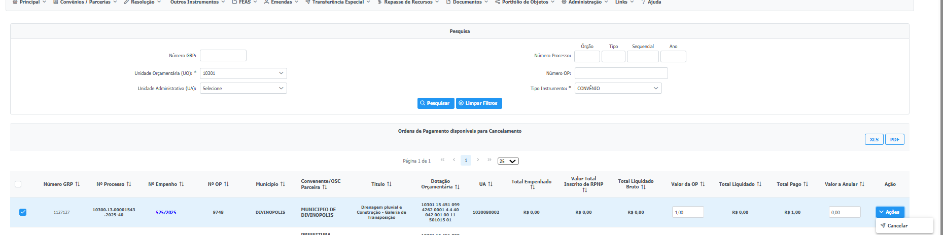 Ao final da página, selecione o(s) instrumento(s) desejado(s) na lista de instrumentos com "Ordens de Pagamento disponíveis para Cancelamento" e clique em "Cancelar":