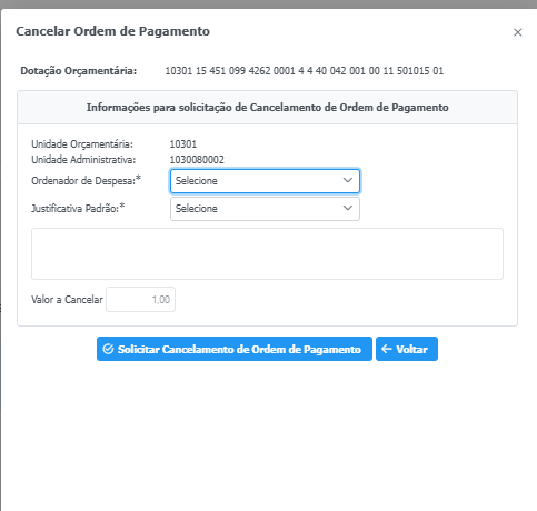 Preencha as informações para a solicitação de cancelamento de ordem de pagamento e clique em "Solicitar Cancelamento de Ordem de Pagamento":