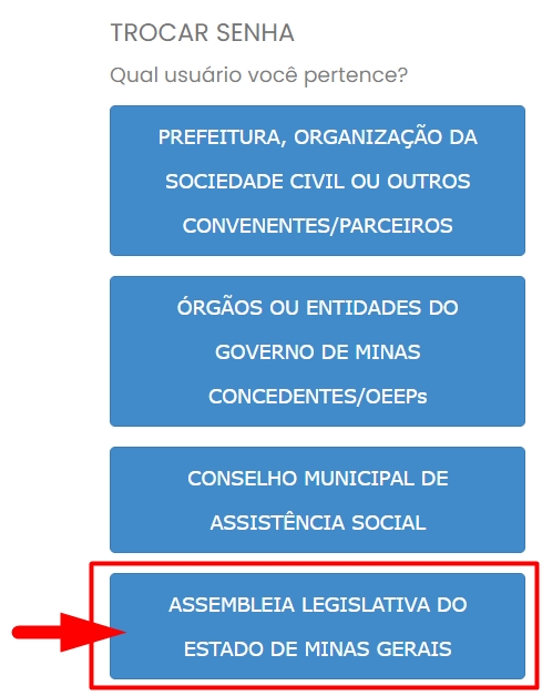 Acesso Órgão ou Entidade Estadual (exceto ALMG)Acesso Parlamentares e Assessores (ALMG)Caso o usuário seja antigo e tenha perdido seu acesso ou a senha revogada, siga para a página de Recuperação de Senha.